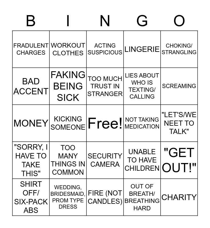 This bingo card has a free space and 24 words: TOO MANY THINGS IN COMMON, WEDDING, BRIDESMAID, PROM TYPE DRESS, TOO MUCH TRUST IN STRANGER, SHIRT OFF/ SIX-PACK ABS, CHOKING/ STRANGLING, FRADULENT CHARGES, BAD ACCENT, WORKOUT CLOTHES, NOT TAKING MEDICATION, SECURITY CAMERA, LIES ABOUT WHO IS TEXTING/ CALLING, MONEY, UNABLE TO HAVE CHILDREN, "GET OUT!", FAKING BEING SICK, OUT OF BREATH/ BREATHING HARD, "LET'S/WE NEET TO TALK", ACTING SUSPICIOUS, SCREAMING, KICKING SOMEONE, CHARITY, "SORRY, I HAVE TO TAKE THIS", LINGERIE and FIRE (NOT CANDLES).