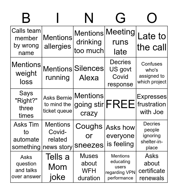 This bingo card has a free space and 24 words: Mentions Covid-related news story, Tells a Mom joke, Silences Alexa, Asks question and talks over answer, Late to the call, Calls team member by wrong name, Mentions weight loss, Mentions allergies, FREE, Coughs or sneezes, Decries US govt Covid response, Says "Right?" three times, Asks how everyone is feeling, Decries people ignoring shelter-in-place, Mentions running, Mentions educating users regarding VPN performance, Expresses frustration with Joe, Mentions drinking too much, Confuses who's assigned to which project, Asks Bernie to mind the ticket queue, Asks about certificate renewals, Asks Tim to automate something, Meeting runs late and Muses about WFH duration.