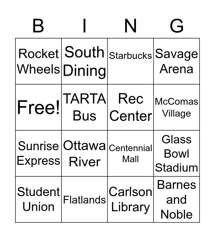 This bingo card has 17 words: Carlson Library, Student Union, Starbucks, Rocket Wheels, Ottawa River, Savage Arena, Glass Bowl Stadium, Rec Center, McComas Village, TARTA Bus, Flatlands, Centennial Mall, Free!, South Dining, Sunrise Express, Gateway and Barnes and Noble.