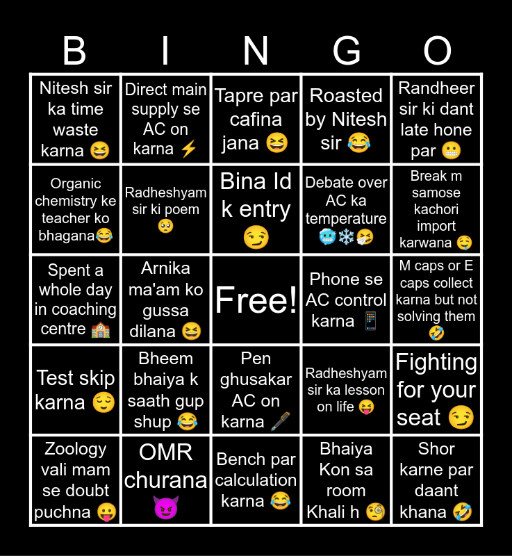 This bingo card has a free space and 24 words: Bheem bhaiya k saath gup shup ๐, OMR churana๐, Bina Id k entry๐, Zoology vali mam se doubt puchna ๐, Randheer sir ki dant late hone par ๐ฌ, Nitesh sir ka time waste karna ๐, Organic chemistry ke teacher ko bhagana๐, Direct main supply se AC on karna โก, Phone se AC control karna ๐ฑ, Pen ghusakar AC on karna ๐๏ธ, Debate over AC ka temperature ๐ฅถโ๏ธ๐คง, Spent a whole day in coaching centre ๐ซ, Radheshyam sir ka lesson on life ๐, Fighting for your seat ๐, Radheshyam sir ki poem ๐ฅบ, Bhaiya Kon sa room Khali h ๐ง, M caps or E caps collect karna but not solving them ๐คฃ, Tapre par cafina jana ๐, Break m samose kachori import karwana ๐คค, Arnika ma'am ko gussa dilana ๐, Shor karne par daant khana ๐คฃ, Test skip karna ๐, Roasted by Nitesh sir ๐ and Bench par calculation karna ๐.