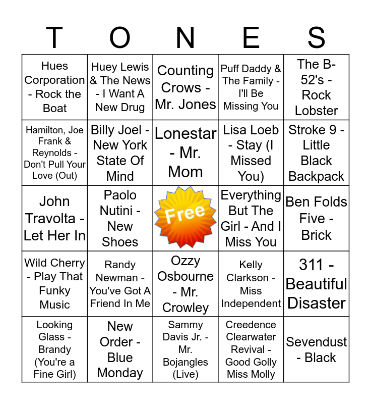 This bingo card has a free space and 75 words: B.W. Stevenson - My Maria, Aladdin - A Whole New World, Counting Crows - Mr. Jones, Brad Paisley - I'm Gonna Miss Her, Thirty Seconds To Mars - Kings And Queens, Bay City Rollers - Saturday Night, Beck - New Pollution, Custom - Hey Mister, Creedence Clearwater Revival - Good Golly Miss Molly, SR 71 - Right Now, Blue Swede - Hooked on a Feeling, Ben Rector - Brand New, Everything But The Girl - And I Miss You, Stroke 9 - Little Black Backpack, Bo Donaldson & The Heywoods - Billy, Don't Be a Hero, Billy Joel - New York State Of Mind, Guns N' Roses - Mr. Brownstone, Kelly Clarkson - Miss Independent, Sum 41 - In Too Deep, Hamilton, Joe Frank & Reynolds - Don't Pull Your Love (Out), Coolio - 1, 2, 3, 4 (Sumpin' New), Lonestar - Mr. Mom, Lisa Loeb - Stay (I Missed You), The B-52's - Rock Lobster, Hues Corporation - Rock the Boat, Days Of The New - Touch, Peel and Stand, Martha Wash - Mr. Big Stuff, Missy Elliott - Work It, 30H!3 - Don't Trust Me, John Sebastian - Welcome Back, Everclear - I Will Buy You A New Life, Mr. Big - To Be With You, Mountain - Mississippi Queen, 311 - Beautiful Disaster, John Travolta - Let Her In, Huey Lewis & The News - I Want A New Drug, Mr. Mister - Broken Wings, New Found Glory - Hit Or Miss, Ben Folds Five - Brick, Looking Glass - Brandy (You're a Fine Girl), INXS - New Sensation, No Doubt - Excuse Me Mr., Spin Doctors - Little Miss Can't Be Wrong, Blink 182 - Adam's song, Neil Sedaka - Bad Blood, Wayne Newton - Danke Schoen, Ozzy Osbourne - Mr. Crowley, Puff Daddy & The Family - I'll Be Missing You, Eve 6 - Inside Out, Starland Vocal Band - Afternoon Delight, New Edition - If It Isn't Love, Sammy Davis Jr. - Mr. Bojangles (Live), Styx - Miss America, Four Non Blondes - What's Up, Stealers Wheel - Stuck in the Middle With You, New Kids On The Block - Step By Step, Shaggy - Mr Lover, AFI - Miss Murder, Maroon 5 - Won't Go Home Without You, The Raspberries - Go All the Way, New Order - Blue Monday, The Beatles - Being For The Benefit Of Mr. Kite!, John Waite - Missing You, Powerman 5000 - When Worlds Collide, Three Dog Night - Joy to the World, Paolo Nutini - New Shoes, The Byrds - Mr. Tambourine Man, Outkast - Miss Jackson, Seven Mary Three - Water's Edge, Wild Cherry - Play That Funky Music, Randy Newman - You've Got A Friend In Me, The Killers - Mr. Brightside, Panic! At The Disco - Miss Jackson, Sevendust - Black and The Marvelettes - Please Mr. Postman.