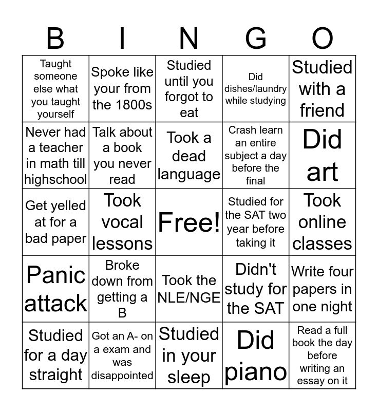 This bingo card has a free space and 24 words: Broke down from getting a B, Got an A- on a exam and was disappointed, Took a dead language, Studied for a day straight, Studied with a friend, Taught someone else what you taught yourself, Never had a teacher in math till highschool, Spoke like your from the 1800s, Studied for the SAT two year before taking it, Took the NLE/NGE, Crash learn an entire subject a day before the final, Get yelled at for a bad paper, Didn't study for the SAT, Write four papers in one night, Talk about a book you never read, Did piano, Took online classes, Studied until you forgot to eat, Did art, Took vocal lessons, Read a full book the day before writing an essay on it, Panic attack, Did dishes/laundry while studying and Studied in your sleep.