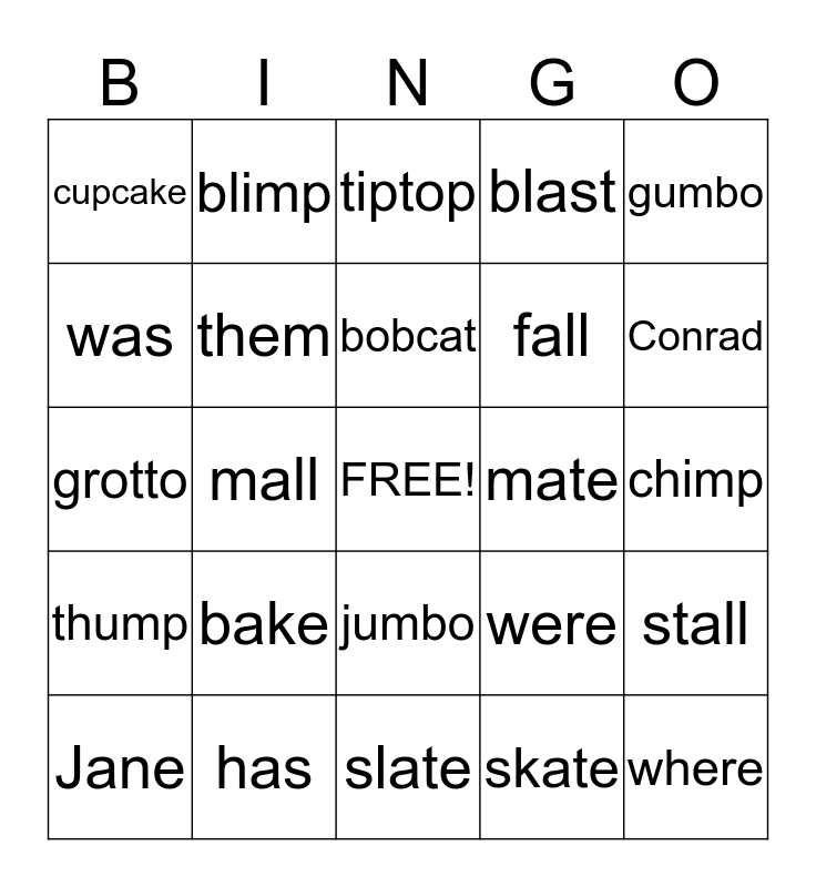 This bingo card has a free space and 24 words: bake, has, bobcat, Jane, gumbo, cupcake, was, blimp, mate, jumbo, fall, grotto, were, stall, them, skate, chimp, tiptop, Conrad, mall, where, thump, blast and slate.