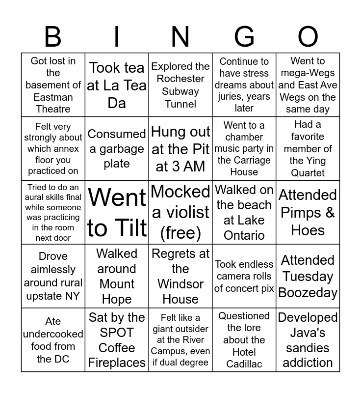 This bingo card has a free space and 24 words: Walked around Mount Hope, Sat by the SPOT Coffee Fireplaces, Hung out at the Pit at 3 AM, Ate undercooked food from the DC, Went to mega-Wegs and East Ave Wegs on the same day, Got lost in the basement of Eastman Theatre, Felt very strongly about which annex floor you practiced on, Took tea at La Tea Da, Walked on the beach at Lake Ontario, Regrets at the Windsor House, Went to a chamber music party in the Carriage House, Tried to do an aural skills final while someone was practicing in the room next door, Took endless camera rolls of concert pix, Attended Tuesday Boozeday, Consumed a garbage plate, Questioned the lore about the Hotel Cadillac, Attended Pimps & Hoes, Explored the Rochester Subway Tunnel, Had a favorite member of the Ying Quartet, Went to Tilt, Developed Java's sandies addiction, Drove aimlessly around rural upstate NY, Continue to have stress dreams about juries, years later and Felt like a giant outsider at the River Campus, even if dual degree.