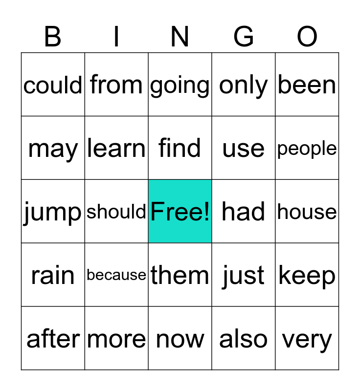 This bingo card has a free space and 24 words: after, because, find, also, been, could, from, going, had, house, jump, learn, just, keep, may, more, now, only, people, rain, should, them, use and very.