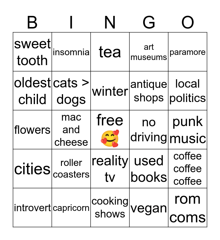 This bingo card has a free space and 24 words: roller coasters, capricorn, winter, introvert, paramore, sweet tooth, oldest child, insomnia, no driving, reality tv, antique shops, flowers, used books, coffee coffee coffee, cats > dogs, vegan, punk music, tea, local politics, mac and cheese, rom coms, cities, art museums and cooking shows.
