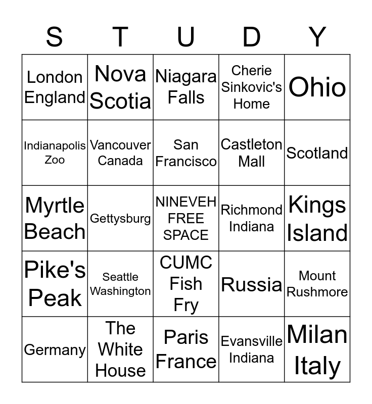 This bingo card has a free space and 24 words: Seattle Washington, The White House, San Francisco, Germany, Ohio, London England, Indianapolis Zoo, Nova Scotia, Richmond Indiana, CUMC Fish Fry, Castleton Mall, Myrtle Beach, Russia, Mount Rushmore, Vancouver Canada, Evansville Indiana, Kings Island, Niagara Falls, Scotland, Gettysburg, Milan Italy, Pike's Peak, Cherie Sinkovic's Home and Paris France.