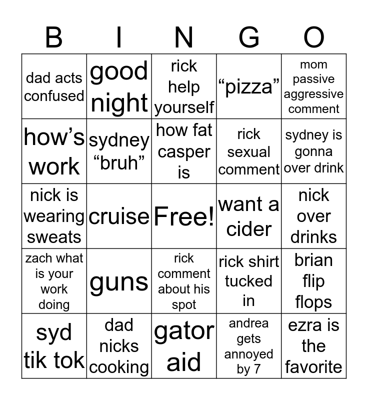 This bingo card has a free space and 24 words: guns, dad nicks cooking, how fat casper is, syd tik tok, mom passive aggressive comment, dad acts confused, how’s work, good night, want a cider, rick comment about his spot, rick sexual comment, nick is wearing sweats, rick shirt tucked in, brian flip flops, sydney “bruh”, andrea gets annoyed by 7, nick over drinks, rick help yourself, sydney is gonna over drink, cruise, ezra is the favorite, zach what is your work doing, “pizza” and gator aid.