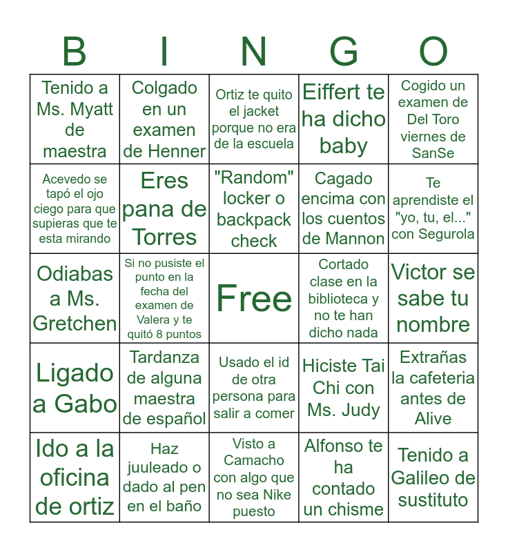 This bingo card has a free space and 24 words: Tardanza de alguna maestra de español, Haz juuleado o dado al pen en el baño, "Random" locker o backpack check, Ido a la oficina de ortiz, Cogido un examen de Del Toro viernes de SanSe, Tenido a Ms. Myatt de maestra, Acevedo se tapó el ojo ciego para que supieras que te esta mirando, Colgado en un examen de Henner, Cortado clase en la biblioteca y no te han dicho nada, Usado el id de otra persona para salir a comer, Cagado encima con los cuentos de Mannon, Odiabas a Ms. Gretchen, Hiciste Tai Chi con Ms. Judy, Extrañas la cafeteria antes de Alive, Eres pana de Torres, Alfonso te ha contado un chisme, Victor se sabe tu nombre, Ortiz te quito el jacket porque no era de la escuela, Te aprendiste el "yo, tu, el..." con Segurola, Si no pusiste el punto en la fecha del examen de Valera y te quitó 8 puntos, Tenido a Galileo de sustituto, Ligado a Gabo, Eiffert te ha dicho baby and Visto a Camacho con algo que no sea Nike puesto.