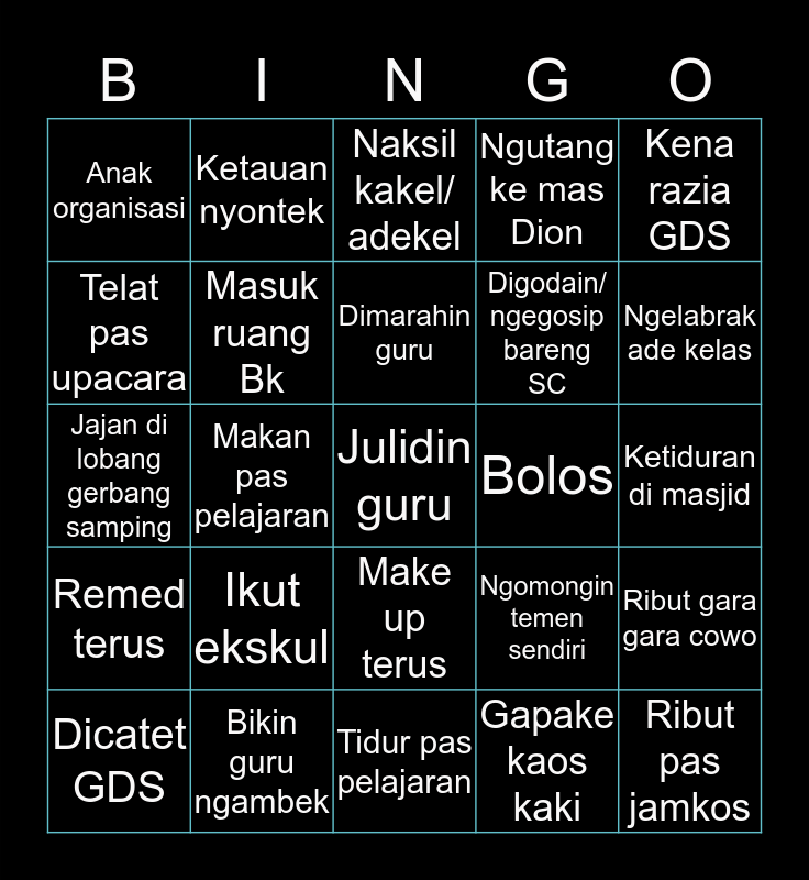 This bingo card has a free space and 24 words: Dicatet GDS, Ikut ekskul, Dimarahin guru, Gapake kaos kaki, Kena razia GDS, Anak organisasi, Ketauan nyontek, Naksil kakel/ adekel, Bolos, Ketiduran di masjid, Jajan di lobang gerbang samping, Masuk ruang Bk, Ngomongin temen sendiri, Ribut gara gara cowo, Telat pas upacara, Bikin guru ngambek, Tidur pas pelajaran, Ngutang ke mas Dion, Ngelabrak ade kelas, Remed terus, Makan pas pelajaran, Make up terus, Digodain/ ngegosip bareng SC and Ribut pas jamkos.
