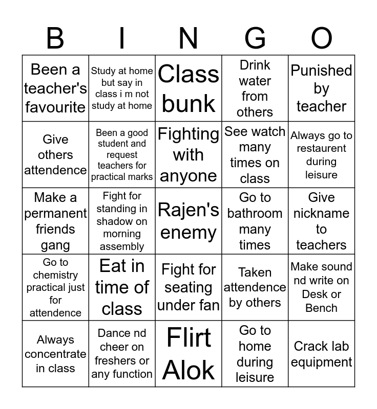 This bingo card has a free space and 29 words: Always concentrate in class, Always go to morning assembly, Fight for standing in shadow on morning assembly, Being bored on class time, Been a teacher's favourite, Class bunk, Been a good student and request teachers for practical marks, Eat in time of class, Go to bathroom many times, Dance nd cheer on freshers or any function, Give nickname to teachers, Crack lab equipment, Flirt Alok, Go to home during leisure, Always go to restaurent during leisure, Go to eat mid day meal during leisure, Fight for seating under fan, Go to chemistry practical just for attendence, Punished by teacher, Make a permanent friends gang, Taken attendence by others, Make noise in time of class, See watch many times on class, Give others attendence, Drink water from others, Study at home but say in class i m not study at home, Make sound nd write on Desk or Bench, Fighting with anyone and Been in love.