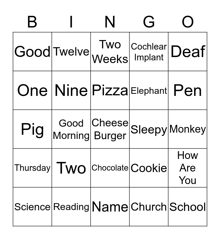 This bingo card has a free space and 38 words: Cow, Tuesday, Teacher, Nine, How Are You, Two, Pizza, Liberty, Deaf, Elephant, Good Morning, Cochlear Implant, School, Monkey, One, Thursday, Aunt, Two Weeks, Horse, Sleepy, Good, Reading, Pen, Science, Book, Name, America, Flag, Math, Spaghetti, Snake, Chocolate, Church, Twelve, Mouse, Cookie, Pig and Pancakes.