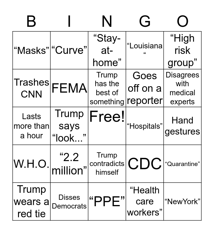 This bingo card has a free space and 29 words: Trump wears a red tie, “Ventilators”, Trump says “look...”, “Testing”, “Masks”, “Stay-at-home”, FEMA, “2.2 million”, “Hospitals”, Disses Democrats, Hand gestures, “NewYork”, “PPE”, “Health care workers”, Disagrees with medical experts, Trump mispronounces a word, Trump contradicts himself, W.H.O., “High risk group”, Lasts more than a hour, CDC, “Italy”, Goes off on a reporter, Trashes CNN, “Louisiana “, “Curve”, “Quarantine”, Trump has the best of something and Man in a coma.