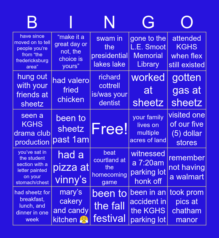This bingo card has a free space and 24 words: had a pizza at vinny’s, mary’s cakery and candy kitchen 😤, richard cottrell is/was your dentist, had sheetz for breakfast, lunch, and dinner in one week, attended KGHS when flex still existed, have since moved on to tell people you’re from “the fredericksburg area”, hung out with your friends at sheetz, “make it a great day or not, the choice is yours”, your family lives on multiple acres of land, beat courtland at the homecoming game, worked at sheetz, seen a KGHS drama club production, witnessed a 7:20am parking lot honk off, remember not having a walmart, had valero fried chicken, been in an accident in the KGHS parking lot, visited one of our five (5) dollar stores, swam in the presidential lakes lake, gotten gas at sheetz, been to sheetz past 1am, took prom pics at chatham manor, you’ve sat in the student section with a letter painted on your stomach/chest, gone to the L.E. Smoot Memorial Library and been to the fall festival.