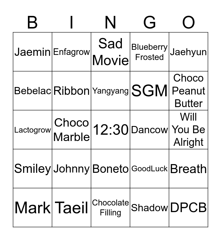 This bingo card has a free space and 24 words: Johnny, Taeil, Yangyang, Mark, Jaehyun, Jaemin, Bebelac, Enfagrow, Dancow, Boneto, SGM, Lactogrow, GoodLuck, Breath, Ribbon, Shadow, Will You Be Alright, Sad Movie, Choco Peanut Butter, Choco Marble, DPCB, Smiley, Blueberry Frosted and Chocolate Filling.