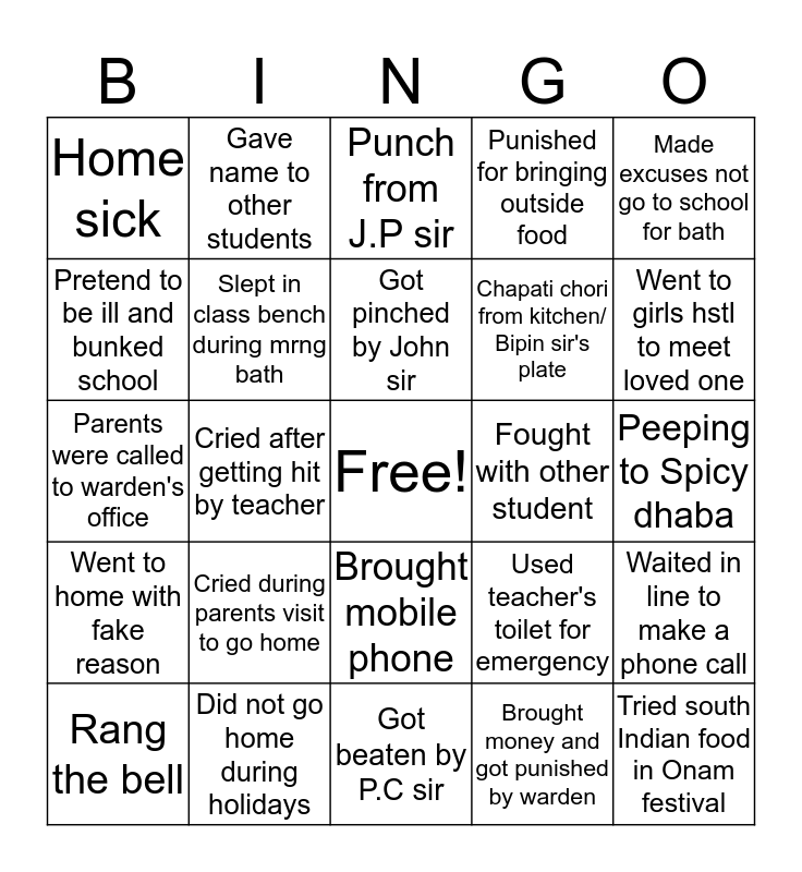 This bingo card has a free space and 25 words: Cried during parents visit to go home, Got beaten by P.C sir, Got pinched by John sir, Rang the bell, Made excuses not go to school for bath, Home sick, Pretend to be ill and bunked school, Gave name to other students, Fought with other student, Brought mobile phone, Chapati chori from kitchen/ Bipin sir's plate, Parents were called to warden's office, Used teacher's toilet for emergency, Waited in line to make a phone call, Slept in class bench during mrng bath, Fought over hot water during bath, Peeping to Spicy dhaba, Punch from J.P sir, Went to girls hstl to meet loved one, Cried after getting hit by teacher, Tried south Indian food in Onam festival, Did not go home during holidays, Went to home with fake reason, Punished for bringing outside food and Brought money and got punished by warden.