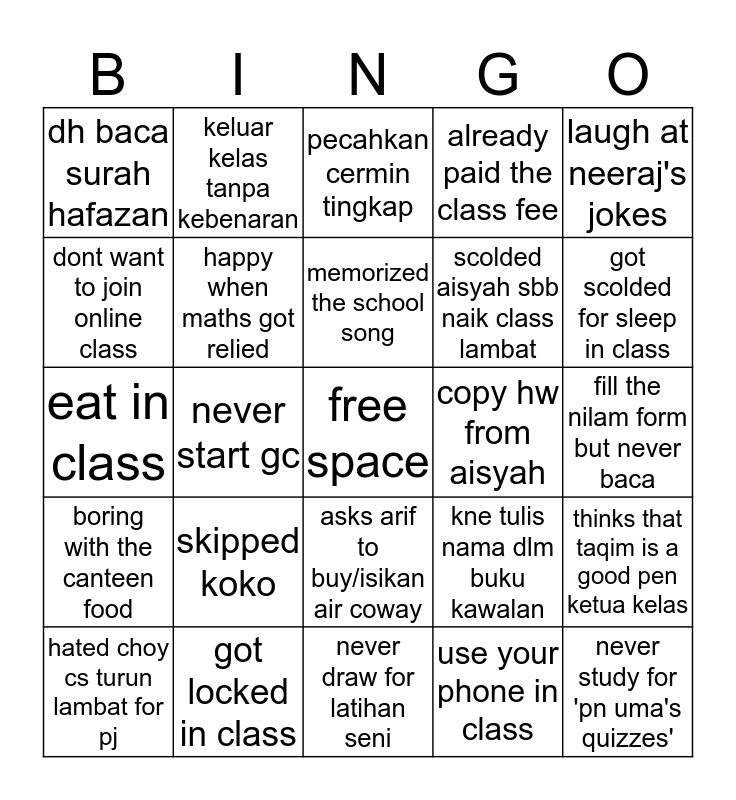 This bingo card has a free space and 24 words: skipped koko, got locked in class, memorized the school song, hated choy cs turun lambat for pj, laugh at neeraj's jokes, dh baca surah hafazan, dont want to join online class, keluar kelas tanpa kebenaran, copy hw from aisyah, asks arif to buy/isikan air coway, scolded aisyah sbb naik class lambat, eat in class, kne tulis nama dlm buku kawalan, thinks that taqim is a good pen ketua kelas, happy when maths got relied, use your phone in class, fill the nilam form but never baca, pecahkan cermin tingkap, got scolded for sleep in class, never start gc, never study for 'pn uma's quizzes', boring with the canteen food, already paid the class fee and never draw for latihan seni.