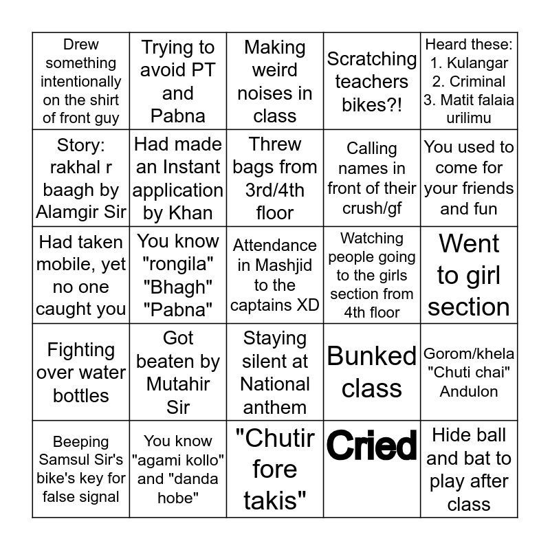 This bingo card has a free space and 24 words: Got beaten by Mutahir Sir, You know "agami kollo" and "danda hobe", Threw bags from 3rd/4th floor, Beeping Samsul Sir's bike's key for false signal, Heard these: 1. Kulangar 2. Criminal 3. Matit falaia urilimu, Drew something intentionally on the shirt of front guy, Story: rakhal r baagh by Alamgir Sir, Trying to avoid PT and Pabna, Watching people going to the girls section from 4th floor, Staying silent at National anthem, Calling names in front of their crush/gf, Had taken mobile, yet no one caught you, Bunked class, Gorom/khela "Chuti chai" Andulon, Had made an Instant application by Khan, Cried, Went to girl section, Making weird noises in class, You used to come for your friends and fun, You know "rongila" "Bhagh" "Pabna", Hide ball and bat to play after class, Fighting over water bottles, Scratching teachers bikes?! and "Chutir fore takis".