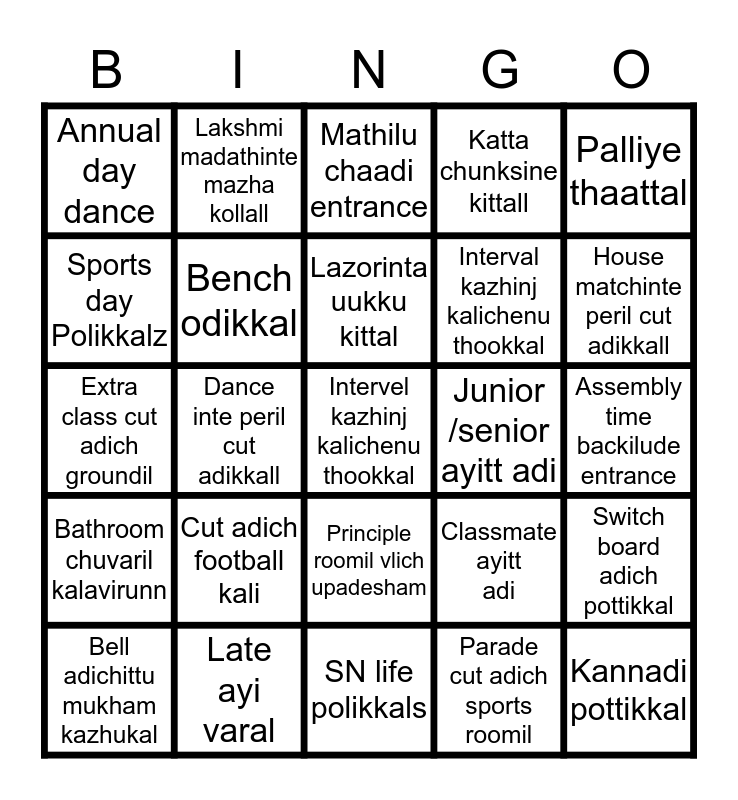 This bingo card has a free space and 24 words: Cut adich football kali, Late ayi varal, Lazorinta uukku kittal, Bell adichittu mukham kazhukal, Palliye thaattal, Annual day dance, Sports day Polikkalz, Lakshmi madathinte mazha kollall, Junior /senior ayitt adi, Principle roomil vlich upadesham, Interval kazhinj kalichenu thookkal, Extra class cut adich groundil, Classmate ayitt adi, Switch board adich pottikkal, Bench odikkal, Parade cut adich sports roomil, Assembly time backilude entrance, Mathilu chaadi entrance, House matchinte peril cut adikkall, Dance inte peril cut adikkall, Kannadi pottikkal, Bathroom chuvaril kalavirunn, Katta chunksine kittall and SN life polikkals.