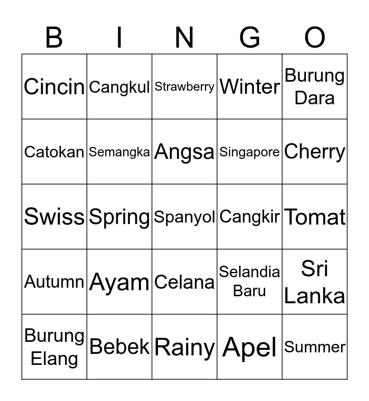 This bingo card has a free space and 24 words: Ayam, Bebek, Angsa, Burung Elang, Burung Dara, Cincin, Catokan, Cangkul, Cangkir, Celana, Singapore, Swiss, Selandia Baru, Sri Lanka, Semangka, Apel, Tomat, Strawberry, Cherry, Spring, Summer, Autumn, Winter and Rainy.