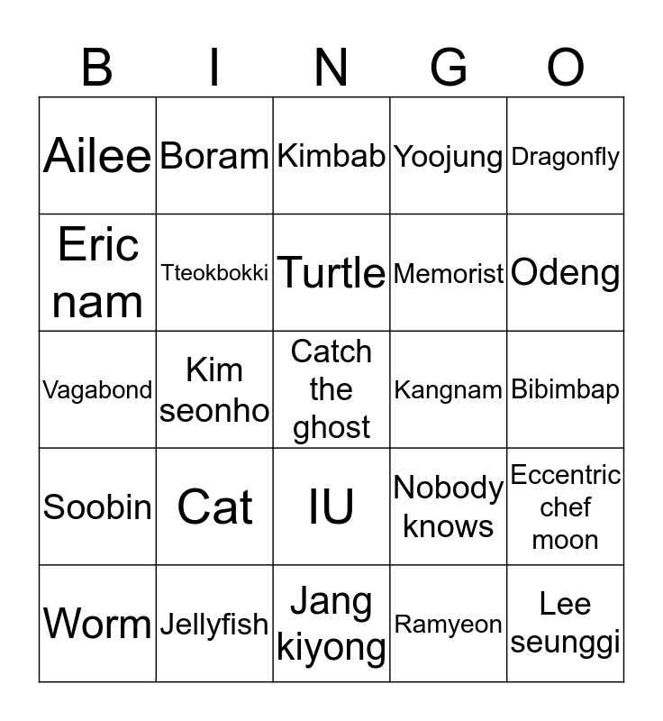 This bingo card has a free space and 24 words: Cat, Jellyfish, Turtle, Worm, Dragonfly, Ailee, Eric nam, Boram, Kangnam, IU, Memorist, Vagabond, Nobody knows, Eccentric chef moon, Tteokbokki, Ramyeon, Bibimbap, Kimbab, Odeng, Kim seonho, Lee seunggi, Soobin, Yoojung and Jang kiyong.
