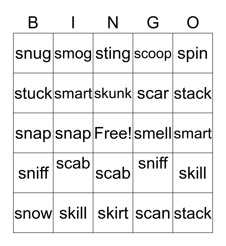 This bingo card has a free space and 48 words: span, stack, snow, skirt, scab, sniff, smog, spark, stuck, smile, smart, scoop, skill, sniff, step, spend, skunk, smell, sting, spin, snap, scan, snug, scar, span, stack, snow, skirt, scab, sniff, snob, spark, stuck, smile, skill, sniff, step, smart, scoop, spend, skunk, smell, sting, spin, snap, scan, snug and scar.