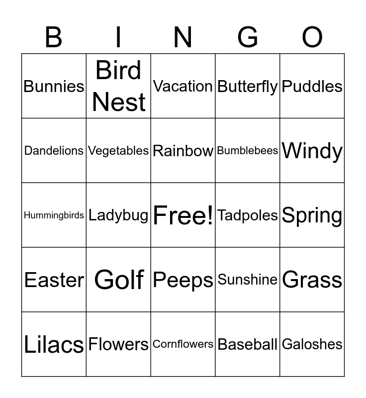 This bingo card has a free space and 36 words: Rain, Daffodils, Garden, Vegetables, Sunshine, Easter, Rainbow, Umbrella, Puddles, BBQ, Ladybug, Butterfly, Kittens, Tadpoles, Windy, Bunnies, Chickens, Golf, Galoshes, Vacation, Spring, Grass, Flowers, Lilacs, Cornflowers, Bird Nest, Hummingbirds, Fireworks, Bumblebees, Dandelions, Pollen, Allergies, Baseball, Peeps, Jelly Beans and Picnic.