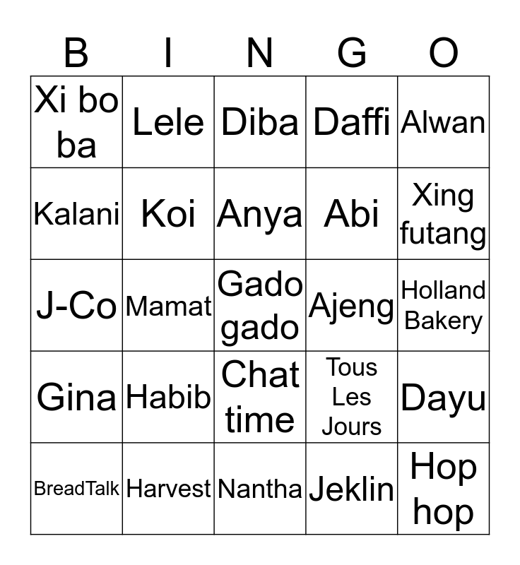 This bingo card has a free space and 24 words: Habib, Harvest, Anya, BreadTalk, Alwan, Xi bo ba, Kalani, Lele, Ajeng, Chat time, Abi, J-Co, Tous Les Jours, Dayu, Koi, Jeklin, Holland Bakery, Diba, Xing futang, Mamat, Hop hop, Gina, Daffi and Nantha.
