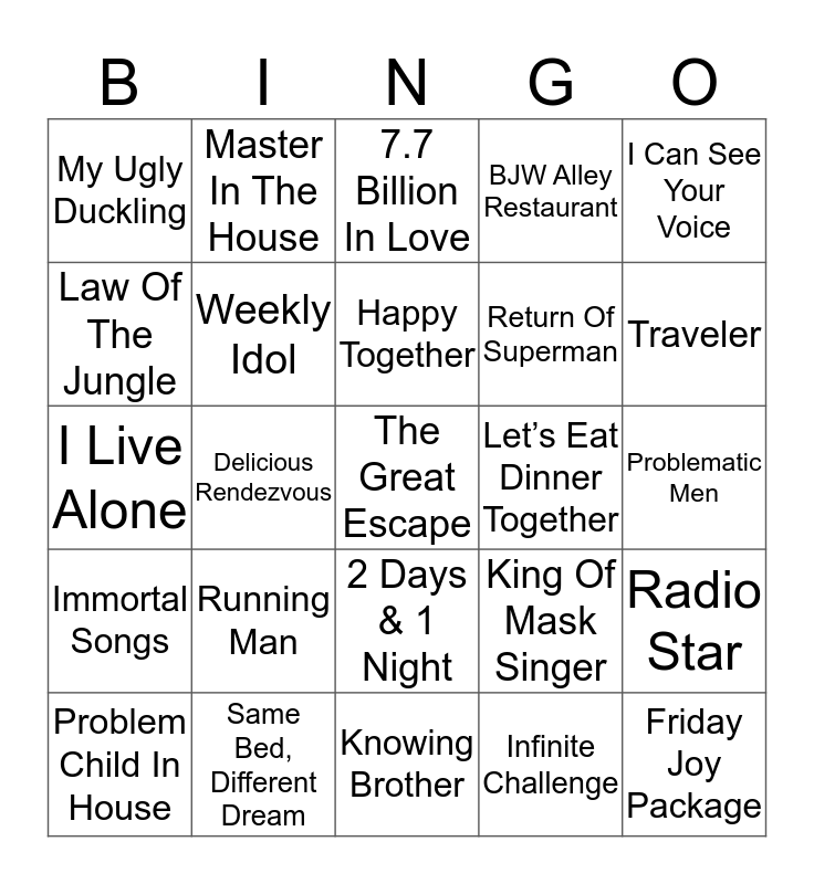 This bingo card has 25 words: Running Man, Knowing Brother, Happy Together, Problem Child In House, I Can See Your Voice, My Ugly Duckling, Law Of The Jungle, Master In The House, Let’s Eat Dinner Together, 2 Days & 1 Night, Return Of Superman, I Live Alone, King Of Mask Singer, Radio Star, Weekly Idol, Friday Joy Package, Problematic Men, 7.7 Billion In Love, Traveler, Delicious Rendezvous, The Great Escape, Same Bed, Different Dream, Immortal Songs, BJW Alley Restaurant and Infinite Challenge.