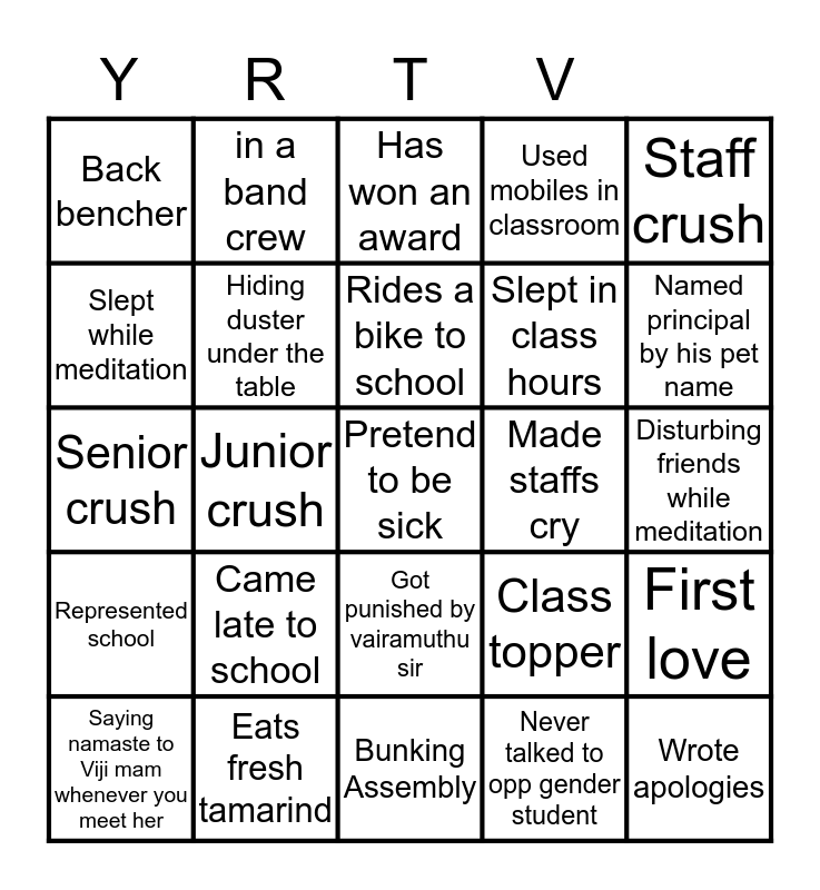 This bingo card has 25 words: Came late to school, Bunking Assembly, Rides a bike to school, Saying namaste to Viji mam whenever you meet her, Staff crush, Back bencher, Slept while meditation, in a band crew, Made staffs cry, Got punished by vairamuthu sir, Slept in class hours, Senior crush, Class topper, First love, Hiding duster under the table, Wrote apologies, Disturbing friends while meditation, Has won an award, Named principal by his pet name, Junior crush, Pretend to be sick, Eats fresh tamarind, Represented school, Used mobiles in classroom and Never talked to opp gender student.