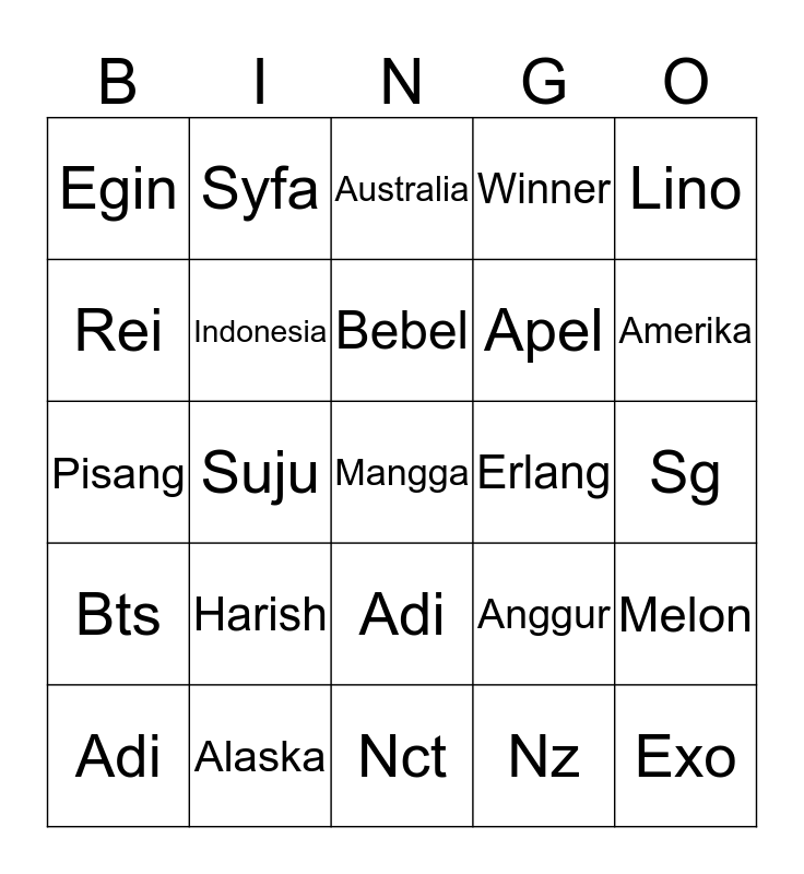 This bingo card has a free space and 24 words: Harish, Alaska, Bebel, Adi, Lino, Egin, Rei, Syfa, Erlang, Adi, Apel, Pisang, Anggur, Melon, Indonesia, Nz, Sg, Australia, Amerika, Suju, Exo, Bts, Winner and Nct.
