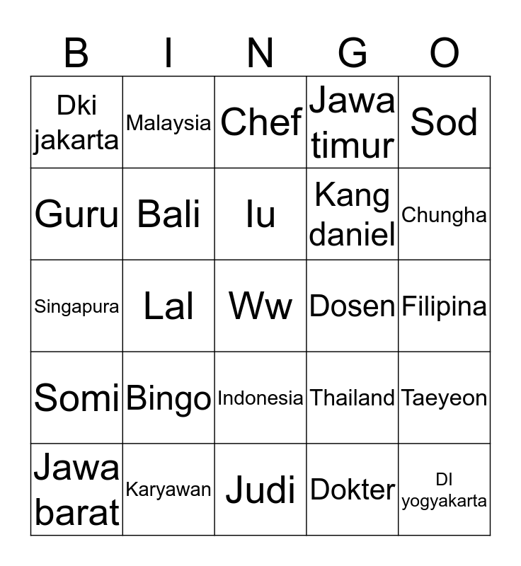 This bingo card has a free space and 24 words: Bingo, Karyawan, Iu, Jawa barat, Sod, Dki jakarta, Guru, Malaysia, Dosen, Indonesia, Kang daniel, Singapura, Thailand, Taeyeon, Bali, Dokter, Filipina, Chef, Chungha, Lal, DI yogyakarta, Somi, Jawa timur and Judi.