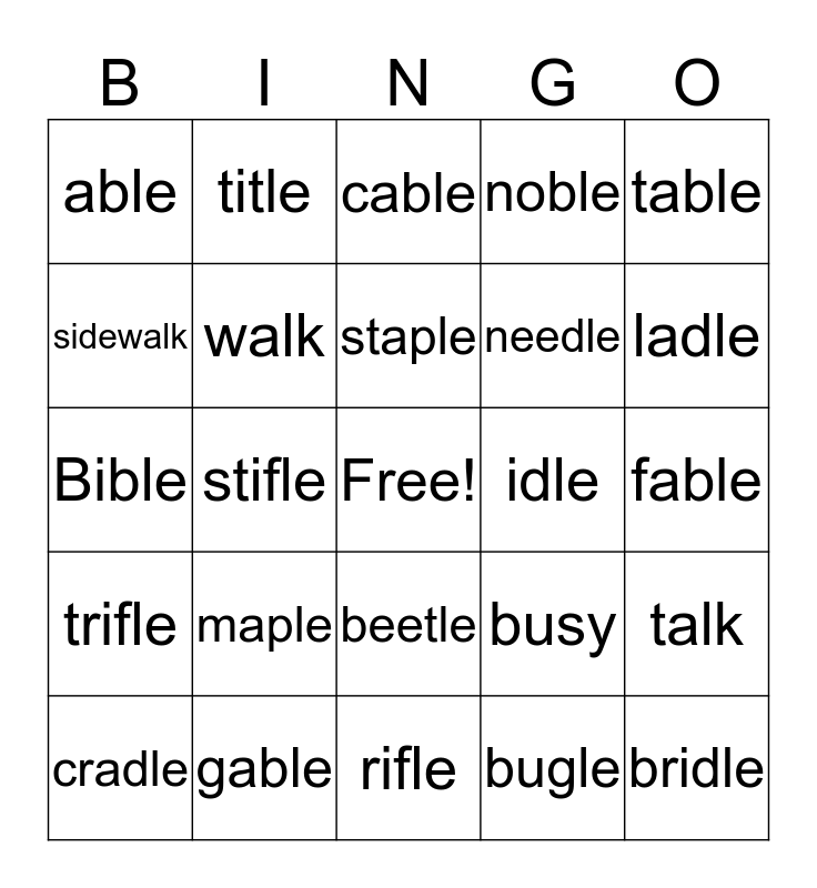 This bingo card has a free space and 25 words: maple, rifle, staple, cradle, table, able, sidewalk, title, idle, beetle, needle, Bible, busy, talk, walk, stable, fable, cable, ladle, stifle, bridle, gable, trifle, noble and bugle.