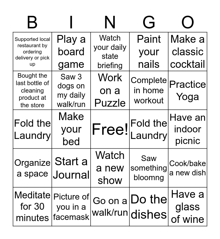 This bingo card has a free space and 24 words: Meditate for 30 minutes, Start a Journal, Work on a Puzzle, Do the dishes, Make a classic cocktail, Supported local restaurant by ordering delivery or pick up, Play a board game, Watch your daily state briefing, Fold the Laundry, Have an indoor picnic, Fold the Laundry, Saw 3 dogs on my daily walk/run, Saw something bloomng, Cook/bake a new dish, Bought the last bottle of cleaning product at the store, Picture of you in a facemask, Go on a walk/run, Paint your nails, Practice Yoga, Organize a space, Make your bed, Watch a new show, Complete in home workout and Have a glass of wine.