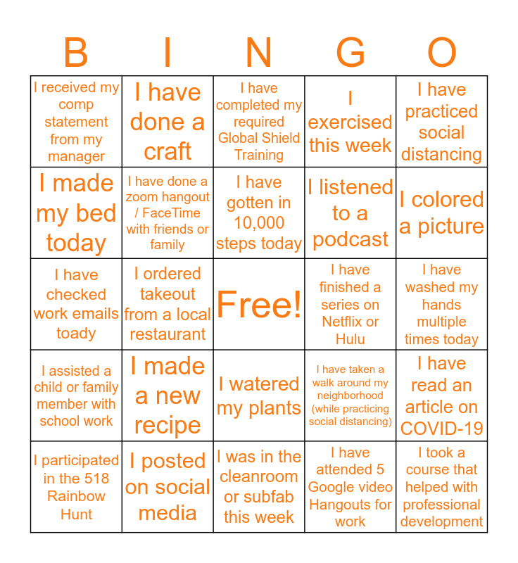 This bingo card has a free space and 24 words: I participated in the 518 Rainbow Hunt, I made a new recipe, I have gotten in 10,000 steps today, I have attended 5 Google video Hangouts for work, I have practiced social distancing, I received my comp statement from my manager, I have done a craft, I have completed my required Global Shield Training, I have finished a series on Netflix or Hulu, I have washed my hands multiple times today, I have checked work emails toady, I have done a zoom hangout / FaceTime with friends or family, I have taken a walk around my neighborhood (while practicing social distancing), I have read an article on COVID-19, I made my bed today, I posted on social media, I was in the cleanroom or subfab this week, I exercised this week, I colored a picture, I assisted a child or family member with school work, I ordered takeout from a local restaurant, I watered my plants, I listened to a podcast and I took a course that helped with professional development.