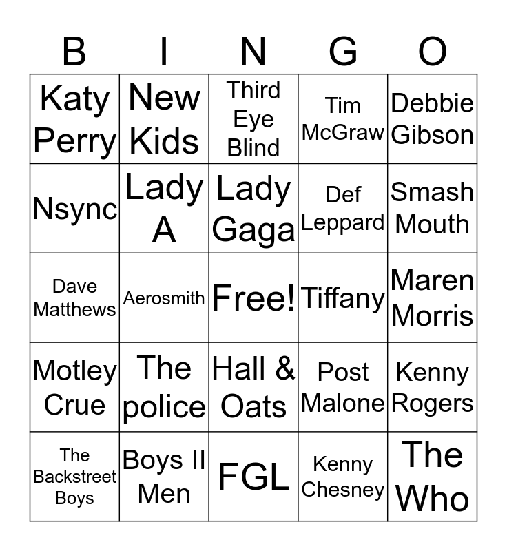 This bingo card has a free space and 24 words: The police, Boys II Men, Lady Gaga, The Backstreet Boys, Debbie Gibson, Katy Perry, Nsync, New Kids, Tiffany, Hall & Oats, Def Leppard, Dave Matthews, Post Malone, Kenny Rogers, Lady A, Kenny Chesney, Maren Morris, Third Eye Blind, Smash Mouth, Aerosmith, The Who, Motley Crue, Tim McGraw and FGL.