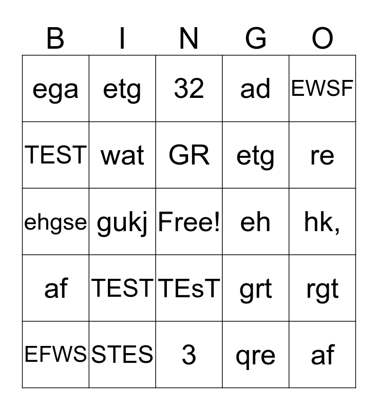 This bingo card has a free space and 24 words: TEST, STES, GR, EFWS, EWSF, ega, TEST, etg, eh, TEsT, etg, ehgse, grt, rgt, wat, qre, hk,, 32, re, gukj, af, af, ad and 3.