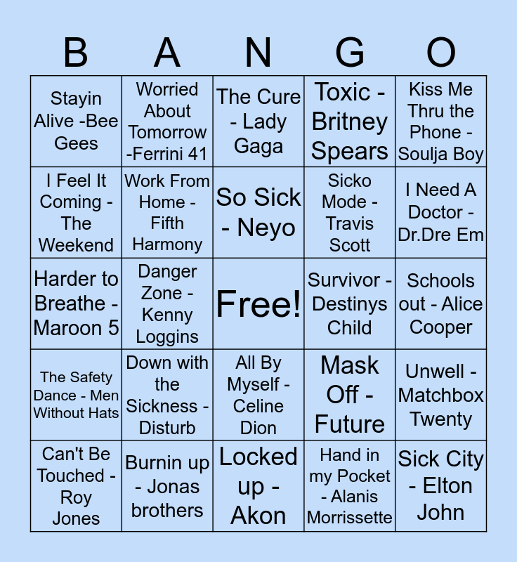 This bingo card has a free space and 24 words: Down with the Sickness - Disturb, Burnin up - Jonas brothers, So Sick - Neyo, Can't Be Touched - Roy Jones, Kiss Me Thru the Phone - Soulja Boy, Stayin Alive -Bee Gees, I Feel It Coming - The Weekend, Worried About Tomorrow -Ferrini 41, Survivor - Destinys Child, All By Myself - Celine Dion, Sicko Mode -Travis Scott, Harder to Breathe - Maroon 5, Mask Off - Future, Unwell - Matchbox Twenty, Work From Home -Fifth Harmony, Hand in my Pocket - Alanis Morrissette, Schools out - Alice Cooper, The Cure - Lady Gaga, I Need A Doctor - Dr.Dre Em, Danger Zone -Kenny Loggins, Sick City - Elton John, The Safety Dance - Men Without Hats, Toxic -Britney Spears and Locked up - Akon.