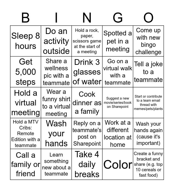This bingo card has a free space and 24 words: Wash your hands, Learn something new about a teammate, Drink 3 glasses of water, Call a family or friend, Come up with new bingo challenge, Sleep 8 hours, Get 5,000 steps, Do an activity outside, Suggest a new movie/series/book on Sharepoint, Reply on a teammate's post on Sharepoint, Go on a virtual walk with a teammate, Hold a virtual meeting, Work at a different location at home, Wash your hands again (cause it's important), Share a wellness pic with a teammate, Color, Start or contribute to a team email thread with memes/pets/plants, Hold a rock, paper, scissors game at the start of a meeting, Tell a joke to a teammate, Wear a funny shirt to a virtual meeting, Create a funny bracket and share (e.g. top 10 cereals or fast food), Hold a MTV Cribs: Remote Edition with a teammate, Spotted a pet in a meeting and Take 4 daily breaks.