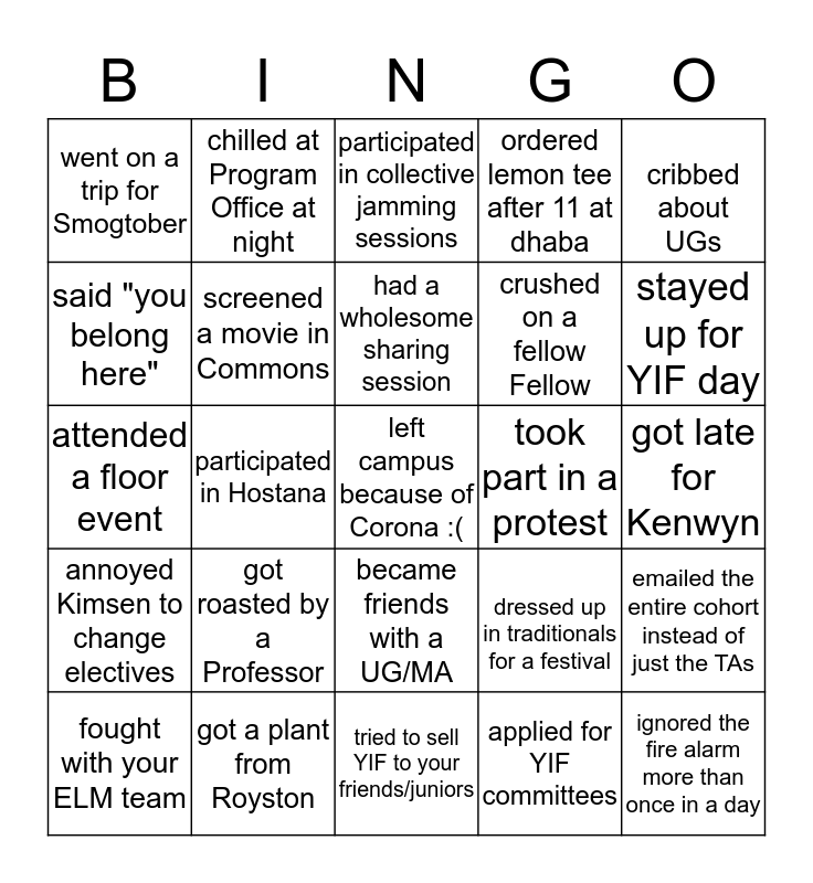 This bingo card has 25 words: got roasted by a Professor, tried to sell YIF to your friends/juniors, had a wholesome sharing session, fought with your ELM team, cribbed about UGs, went on a trip for Smogtober, said "you belong here", chilled at Program Office at night, took part in a protest, became friends with a UG/MA, crushed on a fellow Fellow, attended a floor event, dressed up in traditionals for a festival, emailed the entire cohort instead of just the TAs, screened a movie in Commons, ignored the fire alarm more than once in a day, got late for Kenwyn, participated in collective jamming sessions, stayed up for YIF day, participated in Hostana, left campus because of Corona :(, got a plant from Royston, annoyed Kimsen to change electives, ordered lemon tee after 11 at dhaba and applied for YIF committees.