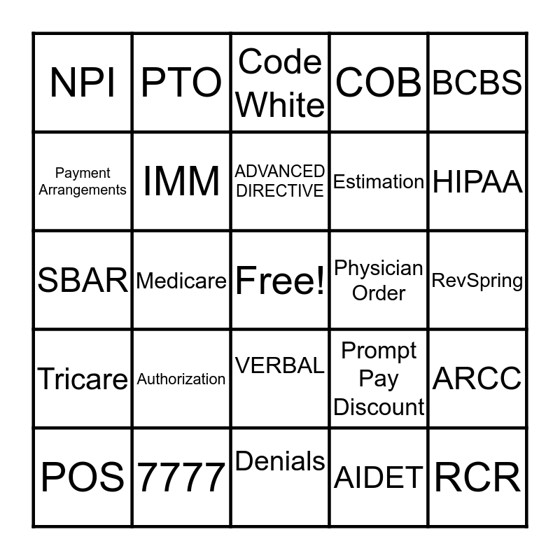 This bingo card has a free space and 39 words: ABN, MSP, MOON, IMM, POS, VERBAL, ADVANCED DIRECTIVE, OBS, BCBS, Tricare, Medicare, COB, RCR, RevSpring, Physician Order, Authorization, Medical Necessity, NPI, Self Pay, Prompt Pay Discount, Payment Arrangements, Denials, Estimation, HIPAA, PHI, EMTALA, ALC, RQA, OON, PTO, IP Only List, Code Red, Code White, 7777, AIDET, STAR, ARCC, SBAR and SAFE.