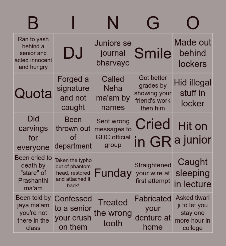 This bingo card has a free space and 29 words: Noted down the shape of tissue to remember hsito slide, Confessed to a senior your crush on them, Juniors se journal bharvaye, Changed your mind to have chai seeing lot of juniors at yash, Made out behind lockers, Ran to yash behind a senior and acted innocent and hungry, Forged a signature and not caught, Called Neha ma'am by names, Cried in GR, Caught sleeping in lecture, Been told by jaya ma'am you're not there in the class, Been thrown out of department, Fabricated your denture at home, Asked tiwari ji to let you stay one more hour in college, Did carvings for everyone, Witnessed the split personality of saurabh sir, Treated the wrong tooth, Straightened your wire at first attempt, Hid illegal stuff in locker, Been cried to death by "stare" of Prashanthi ma'am, Taken the typho out of phantom head, restored and attached it back!, Stubbed a laughter in GR, Got better grades by showing your friend's work then him, Hit on a junior, Quota, DJ, Funday, Smile and GR.