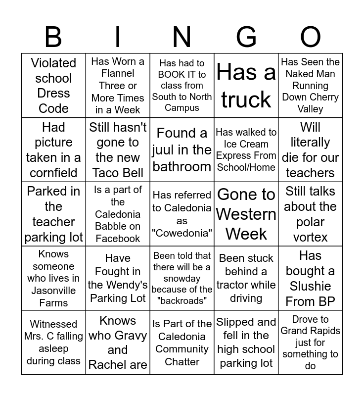 This bingo card has a free space and 24 words: Have Fought in the Wendy's Parking Lot, Knows who Gravy and Rachel are, Found a juul in the bathroom, Witnessed Mrs. C falling asleep during class, Has Seen the Naked Man Running Down Cherry Valley, Violated school Dress Code, Had picture taken in a cornfield, Has Worn a Flannel Three or More Times in a Week, Gone to Western Week, Been told that there will be a snowday because of the "backroads", Has walked to Ice Cream Express From School/Home, Parked in the teacher parking lot, Been stuck behind a tractor while driving, Has bought a Slushie From BP, Still hasn't gone to the new Taco Bell, Slipped and fell in the high school parking lot, Still talks about the polar vortex, Has had to BOOK IT to class from South to North Campus, Will literally die for our teachers, Is a part of the Caledonia Babble on Facebook, Drove to Grand Rapids just for something to do, Knows someone who lives in Jasonville Farms, Has a truck and Is Part of the Caledonia Community Chatter.