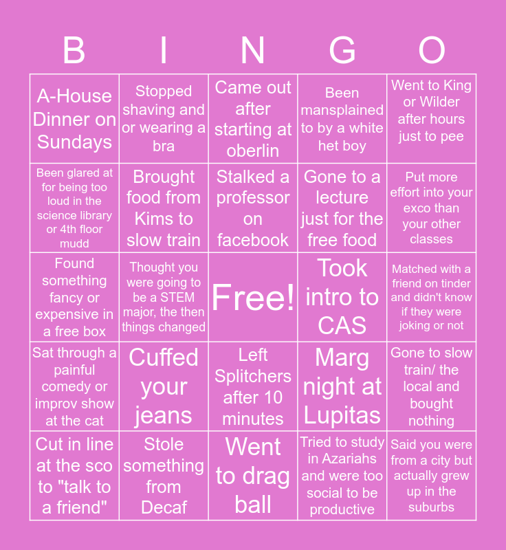 This bingo card has a free space and 24 words: Cuffed your jeans, Stole something from Decaf, Stalked a professor on facebook, Cut in line at the sco to "talk to a friend", Went to King or Wilder after hours just to pee, A-House Dinner on Sundays, Been glared at for being too loud in the science library or 4th floor mudd, Stopped shaving and or wearing a bra, Took intro to CAS, Left Splitchers after 10 minutes, Gone to a lecture just for the free food, Found something fancy or expensive in a free box, Marg night at Lupitas, Gone to slow train/ the local and bought nothing, Brought food from Kims to slow train, Tried to study in Azariahs and were too social to be productive, Matched with a friend on tinder and didn't know if they were joking or not, Came out after starting at oberlin, Put more effort into your exco than your other classes, Thought you were going to be a STEM major, the then things changed, Said you were from a city but actually grew up in the suburbs, Sat through a painful comedy or improv show at the cat, Been mansplained to by a white het boy and Went to drag ball.