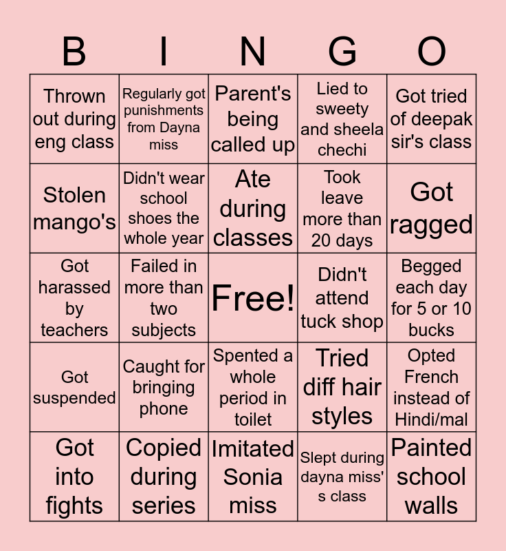 This bingo card has a free space and 25 words: Got suspended, Copied during series, Imitated Sonia miss, Slept during dayna miss' s class, Got tried of deepak sir's class, Thrown out during eng class, Regularly got punishments from Dayna miss, Parent's being called up, Didn't attend tuck shop, Opted French instead of Hindi/mal, Stolen mango's, Didn't wear school shoes the whole year, Faked a parent's sign, Tried diff hair styles, Got ragged, Got into fights, Failed in more than two subjects, Ate during classes, Took leave more than 20 days, Begged each day for 5 or 10 bucks, Got harassed by teachers, Caught for bringing phone, Spented a whole period in toilet, Lied to sweety and sheela chechi and Painted school walls.