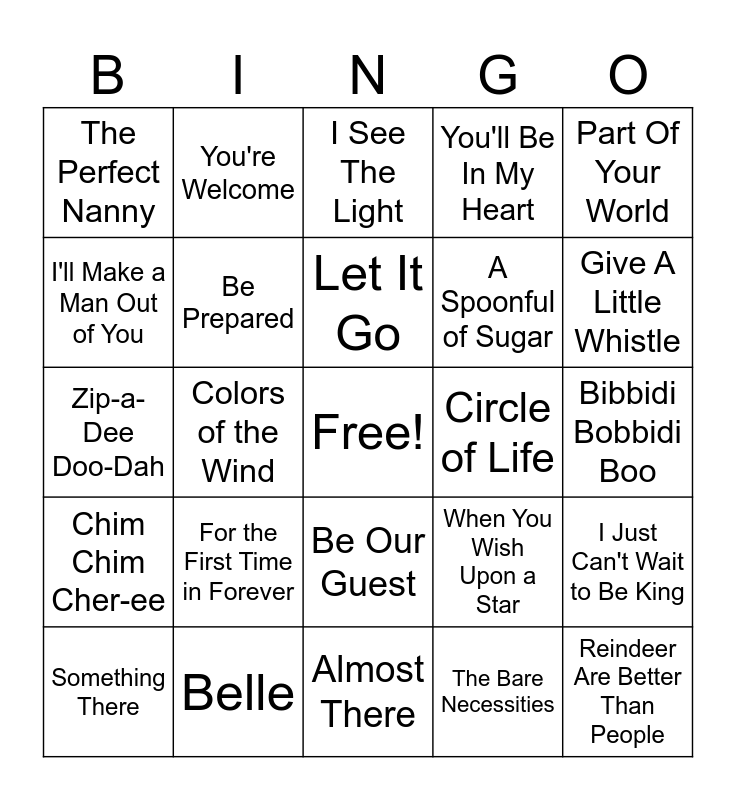 This bingo card has a free space and 39 words: How Far I'll Go, Poor Unfortunate Souls, A Whole New World, Be Prepared, Something There, Be Our Guest, Let It Go, Hakuna Matata, Part Of Your World, Chim Chim Cher-ee, Colors of the Wind, You'll Be In My Heart, Reindeer Are Better Than People, Bibbidi Bobbidi Boo, Circle of Life, For the First Time in Forever, Under the Sea, The Perfect Nanny, You've Got a Friend in Me, When You Wish Upon a Star, I'll Make a Man Out of You, Almost There, A Spoonful of Sugar, Give A Little Whistle, Once Upon a Dream, Kiss the Girl, Arabian Nights, Friend Like Me, Mother Knows Best, You're Welcome, Do You Want to Build a Snowman?, Life Is A Highway, I See The Light, Belle, The Bare Necessities, One Jump Ahead, I Just Can't Wait to Be King, Zip-a-Dee Doo-Dah and Heigh Ho.