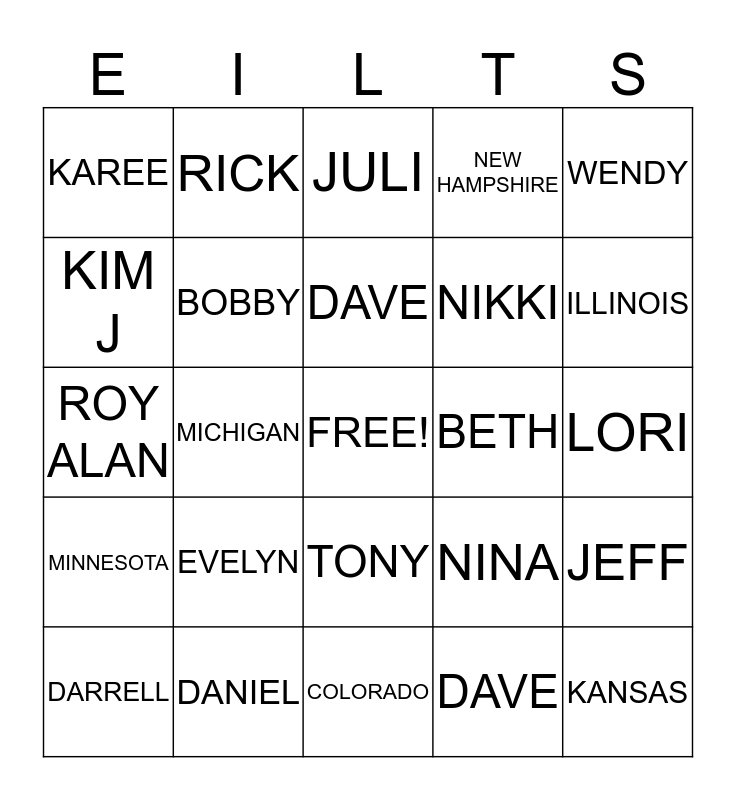 This bingo card has a free space and 24 words: EVELYN, DANIEL, DAVE, DARRELL, WENDY, KAREE, KIM J, RICK, BETH, TONY, NIKKI, ROY ALAN, NINA, JEFF, BOBBY, DAVE, LORI, JULI, ILLINOIS, MICHIGAN, KANSAS, MINNESOTA, NEW HAMPSHIRE and COLORADO.