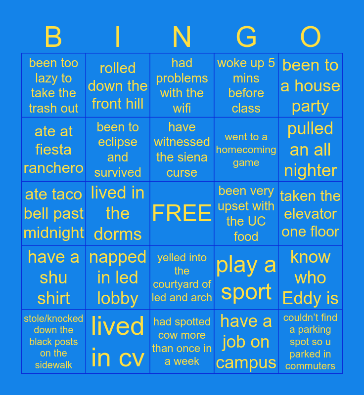 This bingo card has a free space and 24 words: napped in led lobby, lived in cv, have witnessed the siena curse, stole/knocked down the black posts on the sidewalk, been to a house party, been too lazy to take the trash out, ate at fiesta ranchero, rolled down the front hill, been very upset with the UC food, yelled into the courtyard of led and arch, went to a homecoming game, ate taco bell past midnight, play a sport, know who Eddy is, been to eclipse and survived, have a job on campus, taken the elevator one floor, had problems with the wifi, pulled an all nighter, lived in the dorms, couldn’t find a parking spot so u parked in commuters, have a shu shirt, woke up 5 mins before class and had spotted cow more than once in a week.