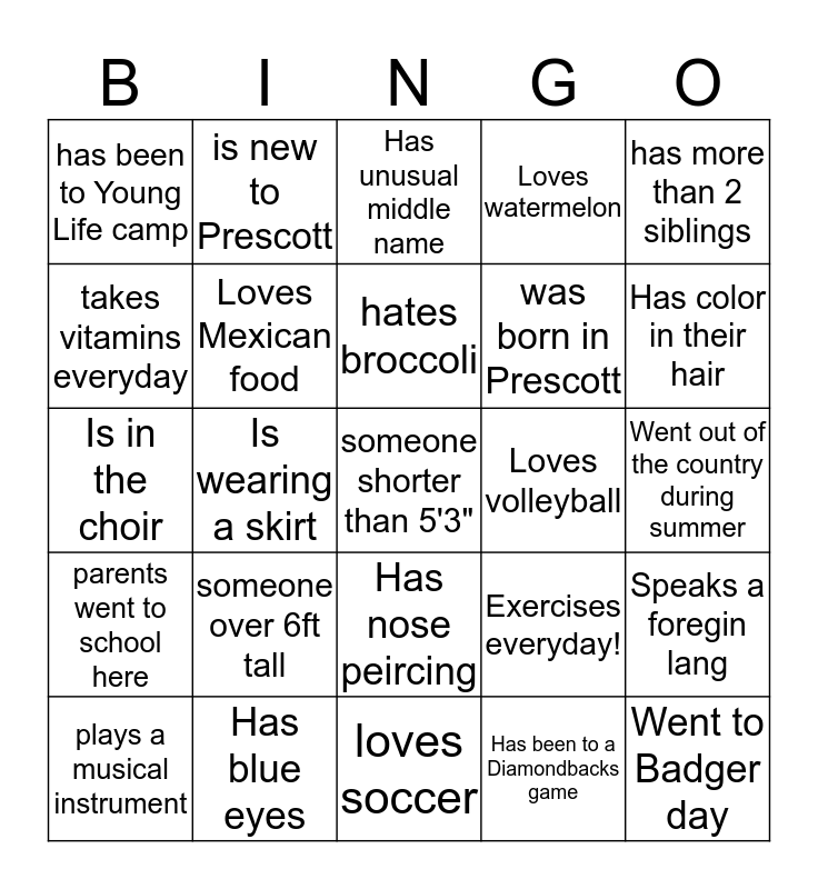 This bingo card has 25 words: someone over 6ft tall, loves soccer, hates broccoli, plays a musical instrument, has more than 2 siblings, has been to Young Life camp, takes vitamins everyday, is new to Prescott, Loves volleyball, Has nose peircing, was born in Prescott, Is in the choir, Exercises everyday!, Speaks a foregin lang, Loves Mexican food, Went to Badger day, Went out of the country during summer, Has unusual middle name, Has color in their hair, Is wearing a skirt, someone shorter than 5'3", Has blue eyes, parents went to school here, Loves watermelon and Has been to a Diamondbacks game.