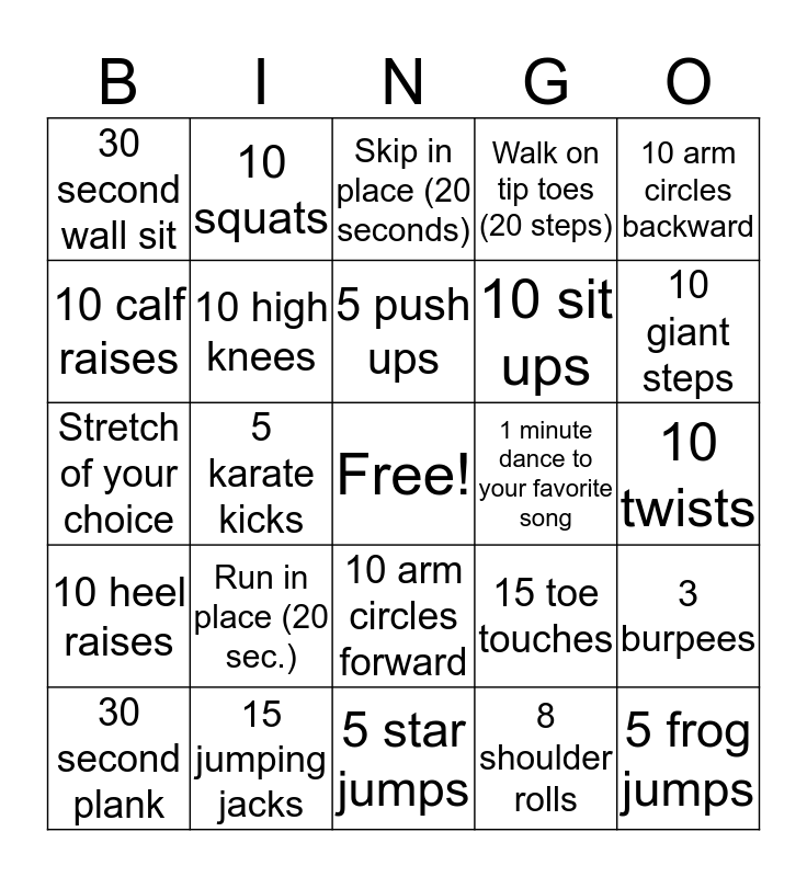 This bingo card has a free space and 24 words: Run in place (20 sec.), 15 jumping jacks, 5 push ups, 30 second plank, 10 arm circles backward, 30 second wall sit, 10 calf raises, 10 squats, 1 minute dance to your favorite song, 10 arm circles forward, 10 sit ups, Stretch of your choice, 15 toe touches, 3 burpees, 10 high knees, 8 shoulder rolls, 10 twists, Skip in place (20 seconds), 10 giant steps, 5 karate kicks, 5 frog jumps, 10 heel raises, Walk on tip toes (20 steps) and 5 star jumps.